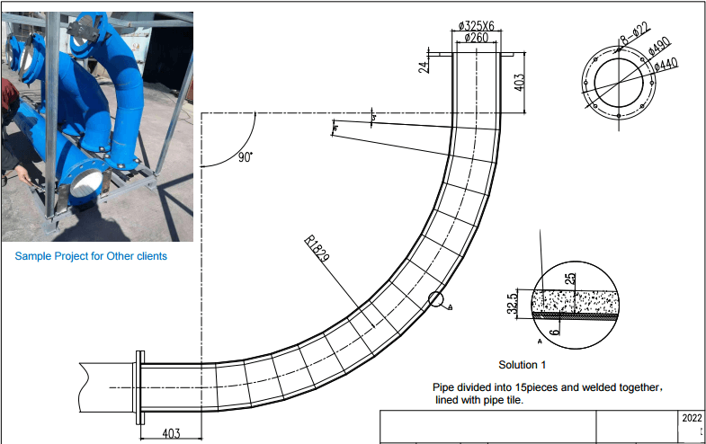 Solution 2: Lined with alumina sleeve/tubes&Elbow pipe tiles, with Dia.100-300mm, Length 100-500mm.